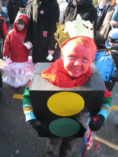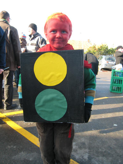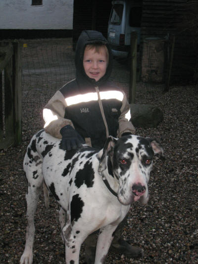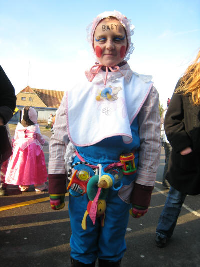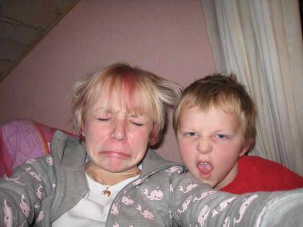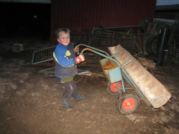 Marinus med hårbånd og den nye traktorsut fra Gitte, som han ikke bryder sig om!!